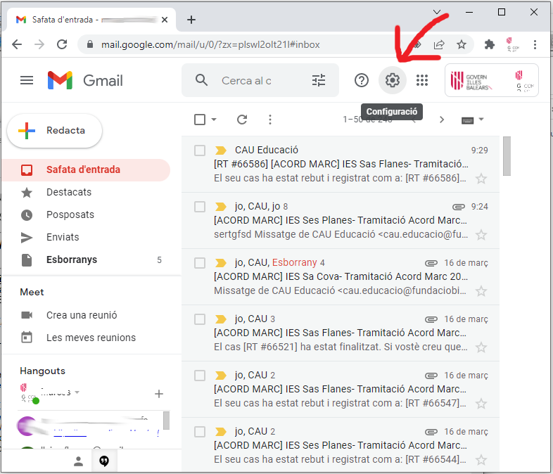 Quan esteu al vostre correu educaib.eu (normalment nomDeCentre@educaib.eu), heu de cercar la roda d’engranatge que hi ha a la part superior dreta (Configuració):