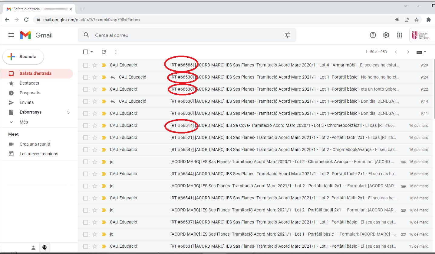 Posteriorment, totes les comunicacions amb conselleria d’aquest expedient via correu electrònic duen el número d’RT a l’assumpte del correu. S’ha de dir que la safata de Gmail en format converses amaga el número d’RT.