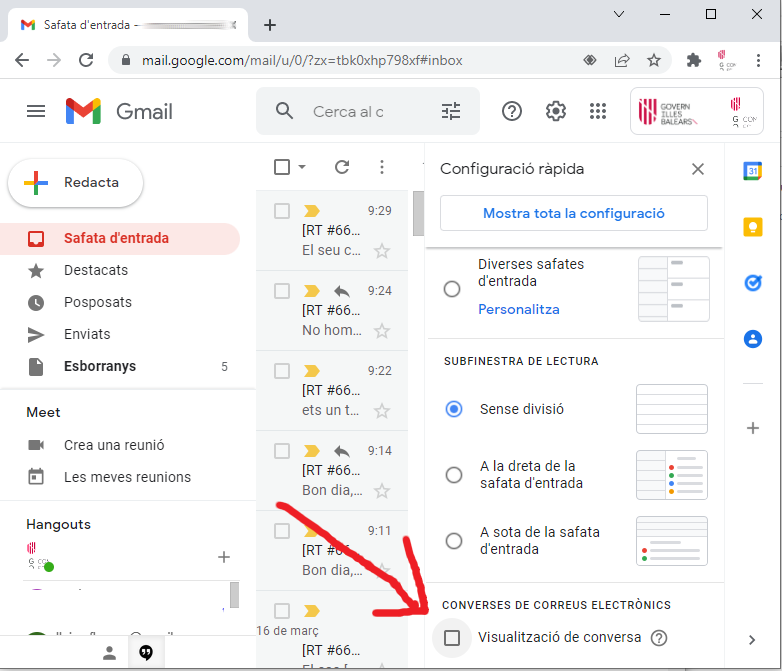 Heu de canviar la visualització de la safata d’entrada del correu educaib.eu que heu utilitzat per a gestionar l’expedient.