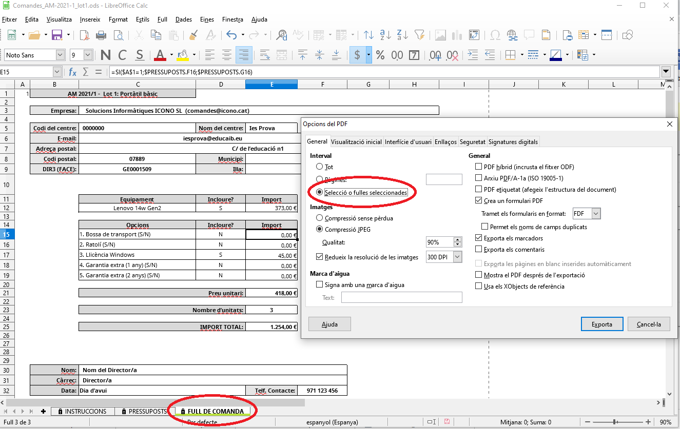 Un cop emplenat el full PRESSUPOSTS, s’ha d’accedir al FULL DE COMANDA i exportar-lo a PDF amb l’opció <Fitxer>-<Exportar a PDF>.
