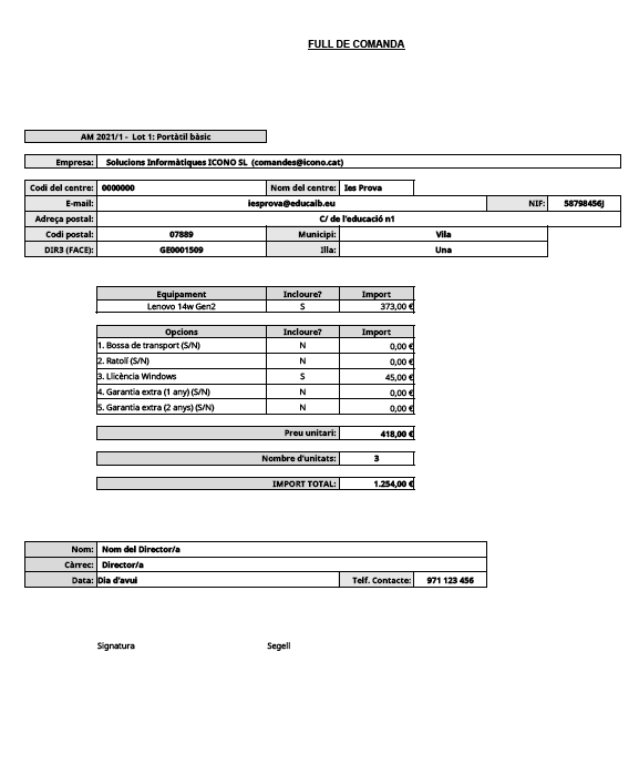 Exemple de Full de Comanda que s’ha de generar en PDF:
